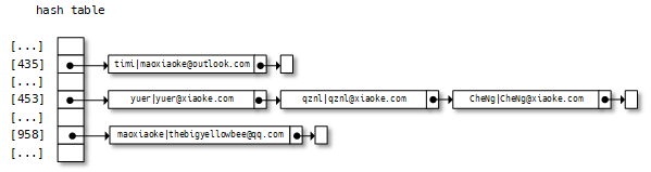 那么,key值为yuer、qznl、CheNg三个元素的散列值都是一样的,为453。好尴尬呀,怎么解决呢。一种为链接法(chaining),另一种称为开放寻址法(open addressing)。